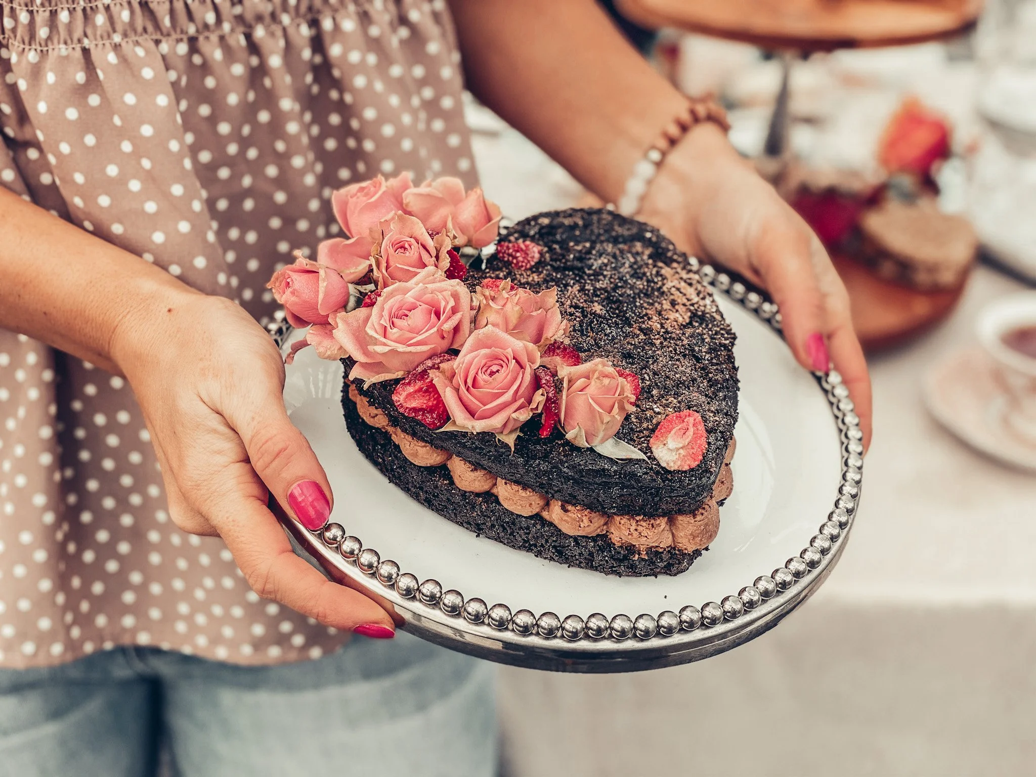 You can never go wrong baking a heart shaped cake. I used my favorite chocolate cake recipe and a chocolate mousse filling for a rich yet simple dessert. I topped it with fresh spray roses and dried strawberries. A little edible pink dust sprinkled on top made it shimmer and feel extra fancy.