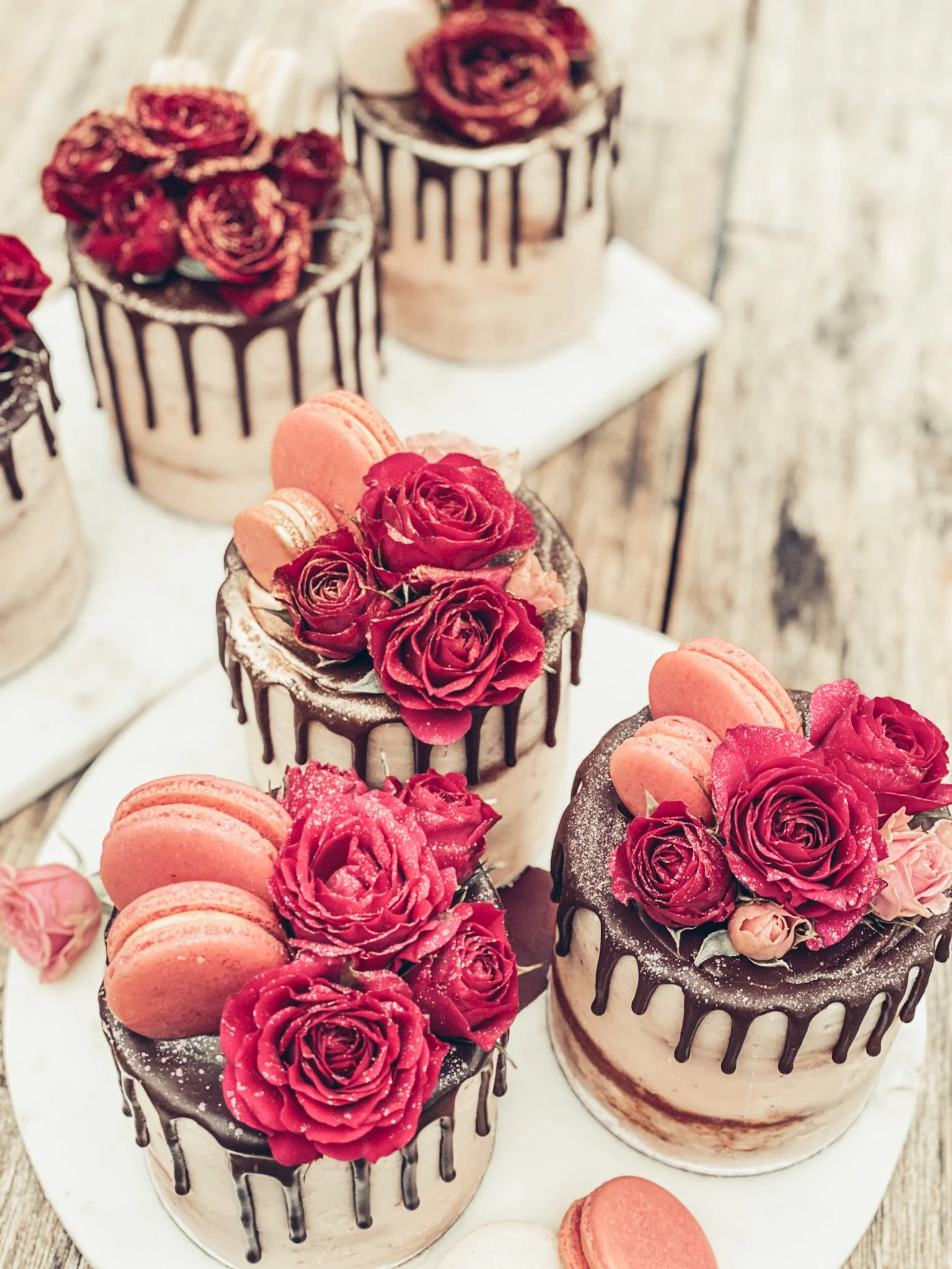Edible gold foil is one of the most asked for decorations on our cakes. Just a piece or two elevates the simplest designs. Heart shaped macarons made these mini cakes memorable.